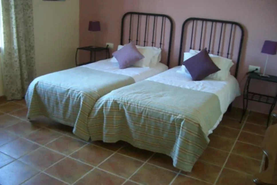 Rolstoeltoegankelijke tweepersoonskamer van 25 m² bij Cortijo La Vista, gelegen op de begane grond met uitzicht op het zwembad, de steeneiken en de omliggende natuur. Momenteel nog in authentieke stijl, later verrijkt met Andalusische accenten. Babybed mogelijk op aanvraag.