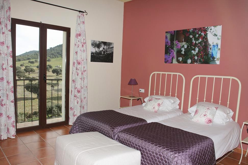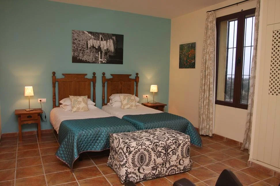 Tweepersoonskamer van 25 m² bij Cortijo La Vista, op de begane grond met uitzicht op het zwembad, de bergen en steeneiken. Momenteel nog in authentieke stijl, later verfijnd met klassieke charme en eigentijdse details. Babybed mogelijk op aanvraag.